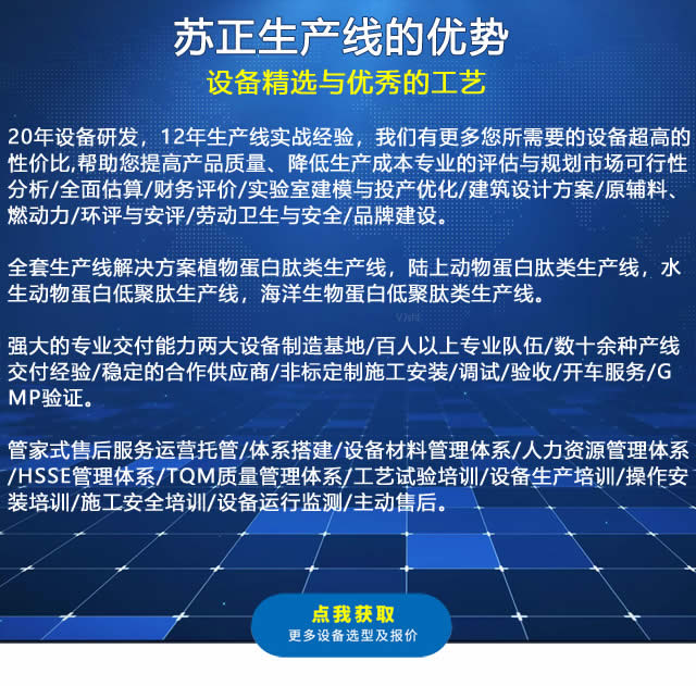 原料的質(zhì)量檢驗(yàn)、原料的前處理、熱提工段、除油工段、生物酶解工段、過濾分離、脫色過濾、濃縮工段、殺菌工段,干燥工段,軟水處理,CIP清洗系統(tǒng)等。
